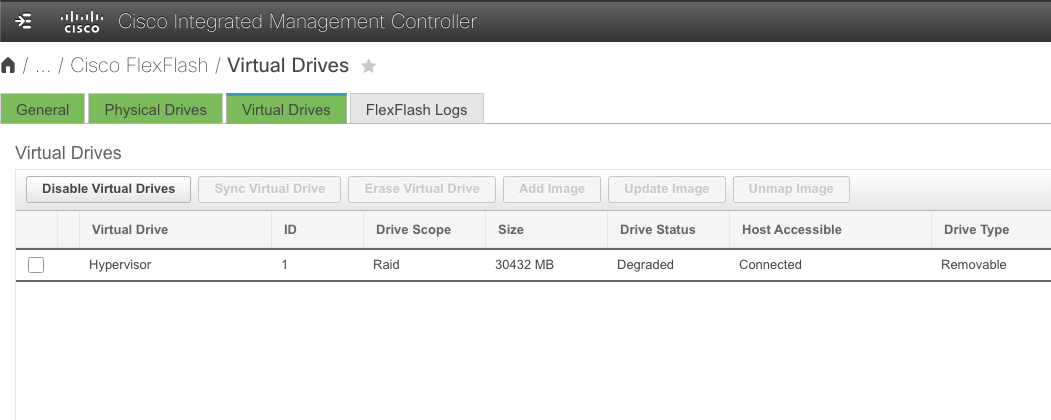 Inside the Cisco UCS there is a 32GB Scandisk SD card which is used by the Cisco FlexFlash Controller, when I was in the BIOS changing the boot order, I noticed the device was referred to the CiscoVD Hypervisor, This is a virtual device and can be seen in the FlexFlash section under virtual drives in CIMC