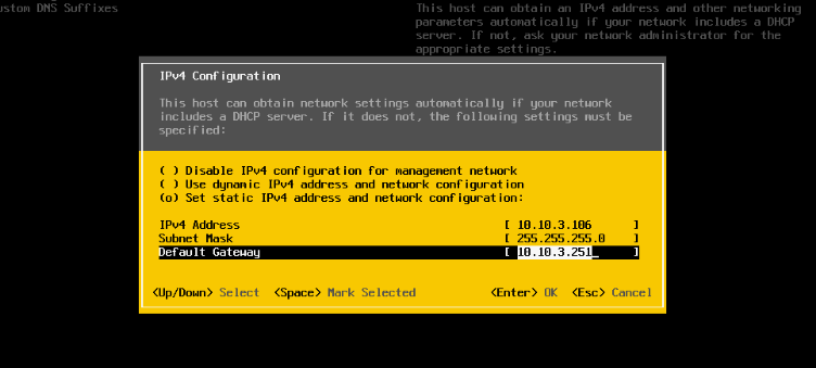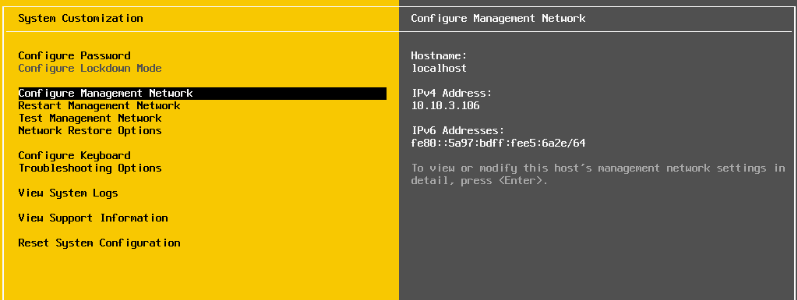 A quick reconfiguration of management interface to a static IP by pressing F2, select "Configure Management Network"