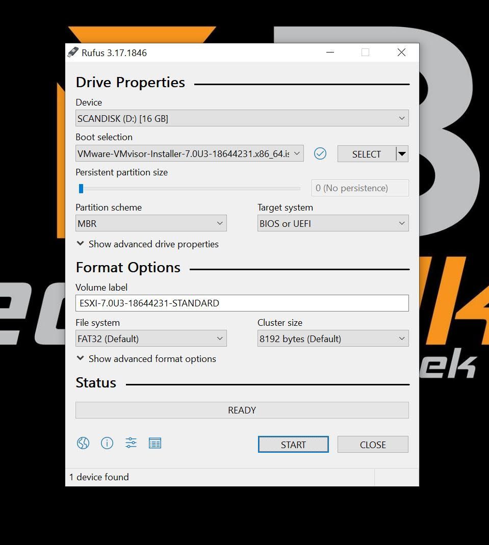 I downloaded the iso and fired up Rufus to create a bootable ESXi USB drive.