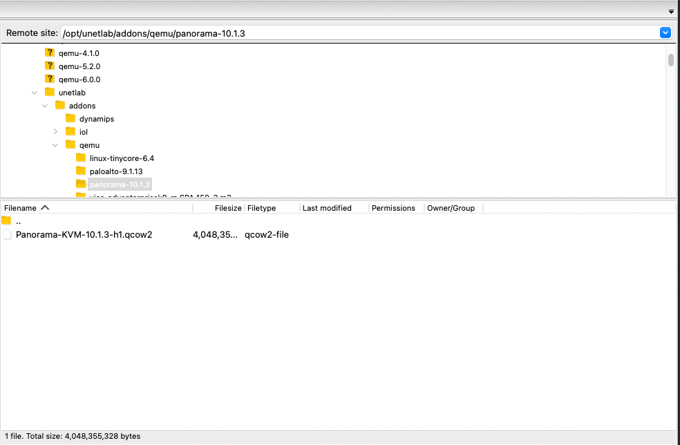 2. Copy the Panorama .qcow2 image to the /opt/unetlab/addons/qemu/panorama-10.1.3 folder using FileZilla or WinSCP as an example. The folder must be named panorama- otherwise EVE-NG won't see the image and it will not be available in the node list.