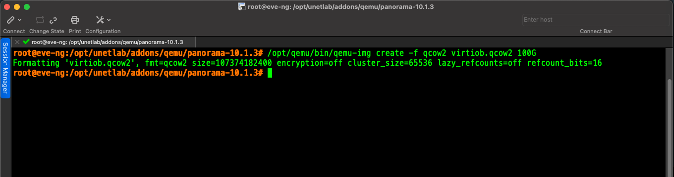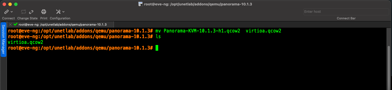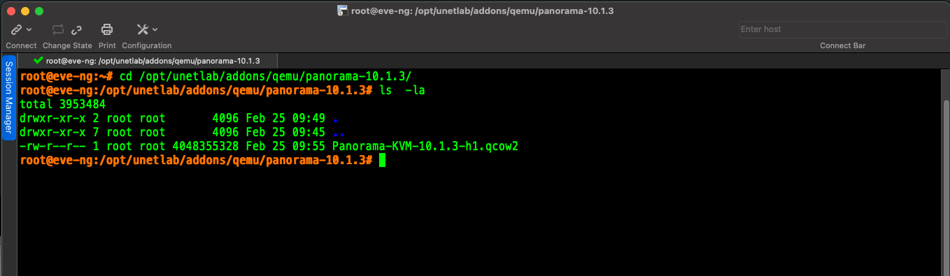 3. From EVE-NG cli, change directory to the new image folder using cd /opt/unetlab/addons/qemu/panorama-10.1.3